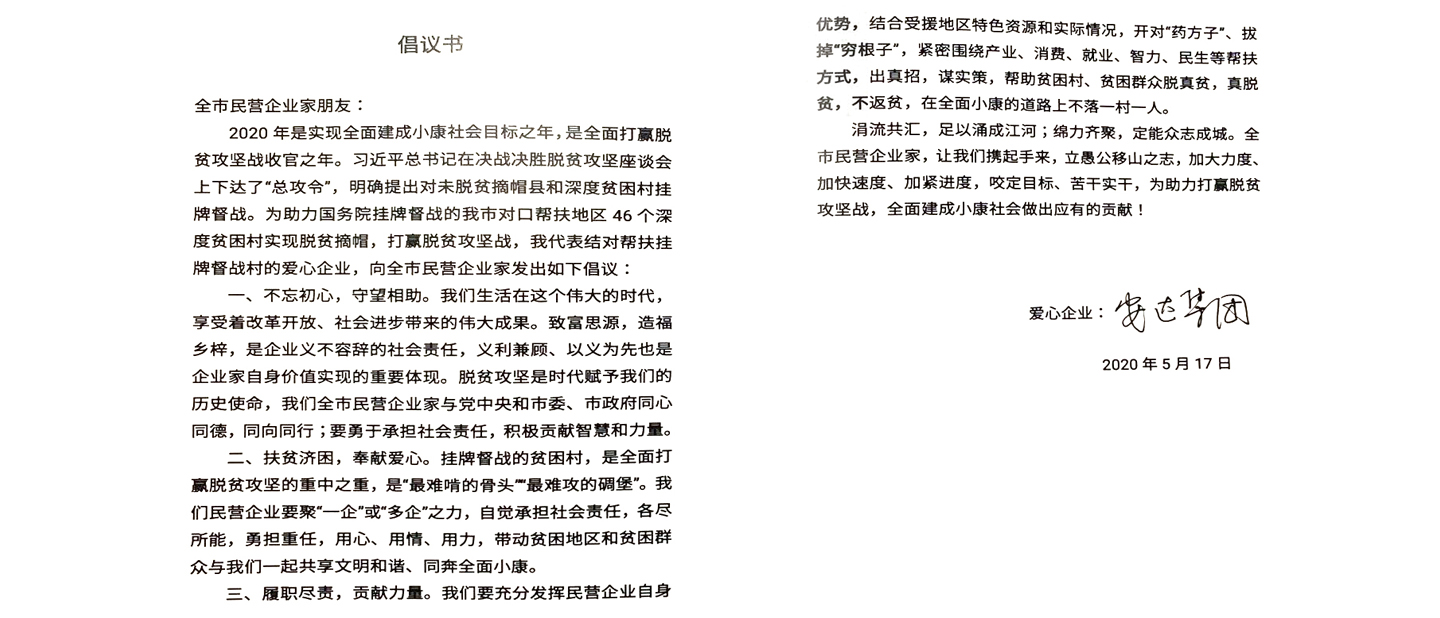 启动仪式上,天津爱心企业以“云聚力”方式发出助力贫困村摘帽行动倡议书,16个区200余家企业进行“云签约”。米兰online(中国)集团作为一家拥有32年历史的优秀企业,在党委书记、董事长崔洪金的带领下,长期坚持慈善公益活动,近年来,响应政府号召,特别关注脱贫攻坚助困工作,通过捐资捐款、购买扶贫产品等方式助力脱贫攻坚工作,今后米兰online(中国)集团还将继续发挥民营企业自身优势,紧密围绕产业、消费、就业、民生等帮扶方式,助力贫困村、贫困群众真脱贫。