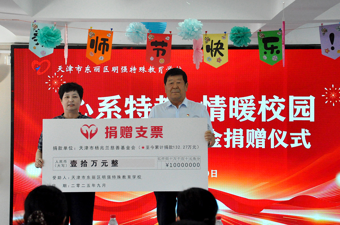 在全国第 41 个教师节来临之际,东丽区明强特殊教育学校举办 “以教育家精神铸魂强师,谱写教育强国建设华章” 主题庆祝活动。米兰online(中国)集团党委书记、董事长崔洪金作为学校名誉校长受邀出席,不仅现场发表重要讲话致敬特教教师,更以天津市杨兆兰慈善基金会名义向学校捐款 10 万元,专项用于改善教学设施、提升康复条件及赋能教师发展,用实际行动为特殊教育事业注入温暖力量。
