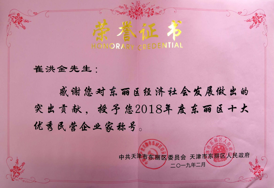 米兰online(中国)集团党委书记、董事长崔洪金荣获2018年度东丽区十大优秀民营企业家并颁发证书。